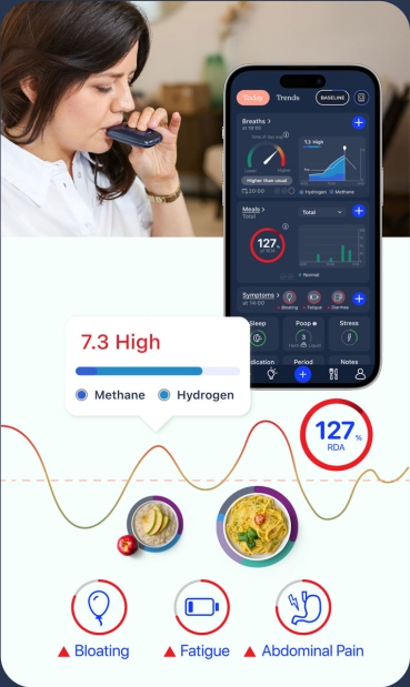 Übernimm die Kontrolle über deine Verdauungsgesundheit – mit unserem fortschrittlichen Atemtestgerät für SIBO, Reizdarm (IBS) und Nahrungsmittelunverträglichkeiten. Erhalte personalisierte Echtzeit-Einblicke, wie bestimmte Lebensmittel dein Verdauungssystem beeinflussen – und reduziere so Blähungen und andere Beschwerden.