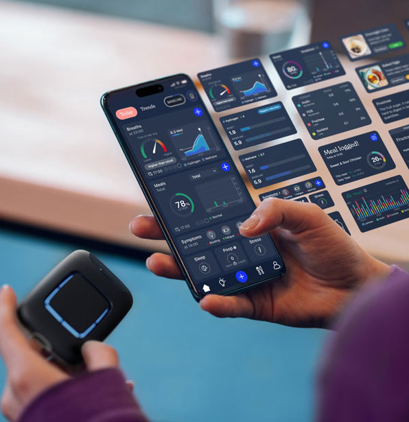 Wenn du einen Test deines Atems machst, messen die Sensoren den Wasserstoff- und Methangehalt und senden die Daten in Echtzeit an die App. Die App liefert dir dann personalisierte Einblicke, damit du deine Verdauung besser verstehst und herausfindest, welche Lebensmittel dir guttun.